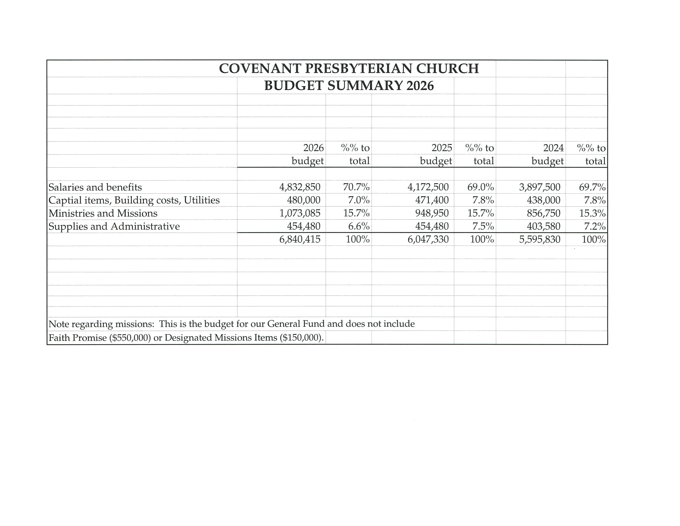 Here you can see a summary of our 2025 budget, as approved by the Session. If you have any questions regarding the 2025 budget, please contact Marty Crawford, mcrawford@covpres.com.